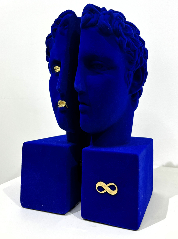 H27.5x16.5x14 cm - Résine composite et velours ultramarine thermocollé / disque infini plaqué or 18K / feuille d'or 22K